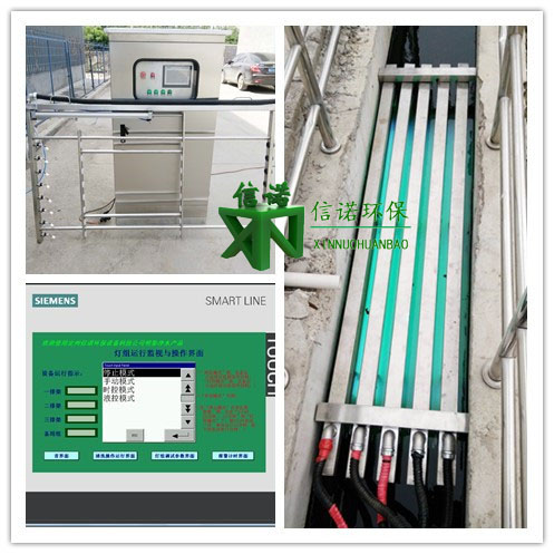信諾明渠式紫外線系統(tǒng)消毒設備模塊安裝于開放式紫外消毒渠中,為了維修方便,配電柜及控制柜均安裝在水渠上方。紫外光燈管排架排列于明渠中,紫外燈管與水流方向一致平行排放!