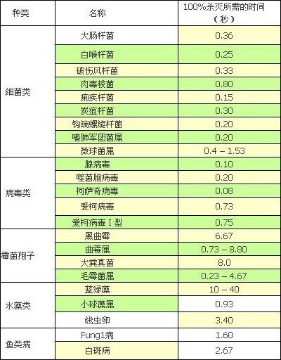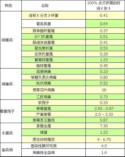 紫外線對殺滅各種細菌病毒殺滅所需時間